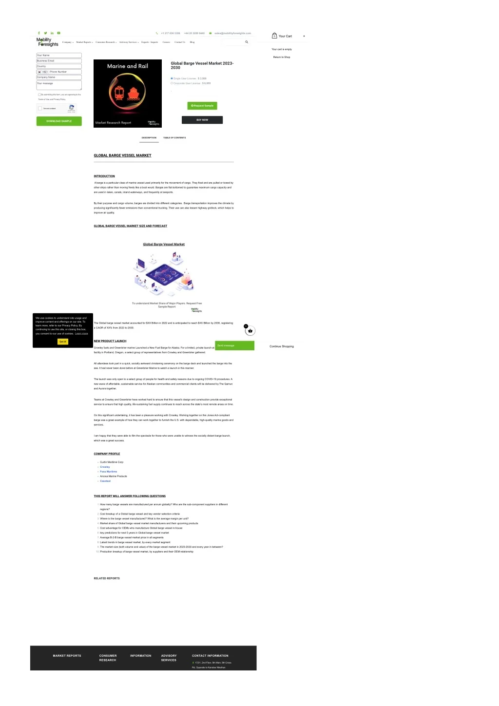 +1 217 636 3356 +44 20 3289 9440 sales@mobilityforesights.com Your Cart 0 Company Market Reports Consumer Research Advisory Services Exports - Imports Careers Contact Us Blog Your cart is empty Your Name Return to Shop Business Email Global Barge Vessel Market 2023- 2030 Country Phone Number +82 Company Name Single User License : $ 3,500 Your message Corporate User License : $ 6,000 . By submitting this form, you are agreeing to the Terms of Use and Privacy Policy. Request Sample I'm not a robot reCAPTCHA Privacy - Terms BUY NOW DOWNLOAD SAMPLE DESCRIPTION TABLE OF CONTENTS GLOBAL BARGE VESSEL MARKET INTRODUCTION A barge is a particular class of marine vessel used primarily for the movement of cargo. They float and are pulled or towed by other ships rather than moving freely like a boat would. Barges are flat-bottomed to guarantee maximum cargo capacity and are used in lakes, canals, inland waterways, and frequently at seaports. By their purpose and cargo volume, barges are divided into different categories. Barge transportation improves the climate by producing significantly fewer emissions than conventional trucking. Their use can also lessen highway gridlock, which helps to improve air quality. GLOBAL BARGE VESSEL MARKET SIZE AND FORECAST We use cookies to understand site usage and improve content and offerings on our site. To learn more, refer to our Privacy Policy. By continuing to use this site, or closing this box, The Global barge vessel market accounted for $XX Billion in 2022 and is anticipated to reach $XX Billion by 2030, registering 0 a CAGR of XX% from 2023 to 2030. Learn more you consent to our use of cookies. NEW PRODUCT LAUNCH Got it! Send message Continue Shopping Crowley fuels and Greenbrier marine Launched a New Fuel Barge for Alaska. For a limited, private launch at Greenbrier’s facility in Portland, Oregon, a select group of representatives from Crowley and Greenbrier gathered. All attendees took part in a quick, socially awkward christening ceremony on the barge deck and launched the barge into the sea. It had never been done before at Greenbrier Marine to watch a launch in this manner. The launch was only open to a select group of people for health and safety reasons due to ongoing COVID-19 procedures. A new wave of affordable, sustainable service for Alaskan communities and commercial clients will be delivered by The Qamun and Aurora together. Teams at Crowley and Greenbrier have worked hard to ensure that this vessel’s design and construction provide exceptional service to ensure that high quality, life-sustaining fuel supply continues to reach across the state’s most remote areas on time. On this significant undertaking, it has been a pleasure working with Crowley. Working together on this Jones Act-compliant barge was a great example of how they can work together to furnish the U.S. with dependable, high-quality marine goods and services. I am happy that they were able to film the spectacle for those who were unable to witness the socially distant barge launch, which was a great success. COMPANY PROFILE Curtin Maritime Corp Crowley Foss Maritime Arcosa Marine Products Casetext THIS REPORT WILL ANSWER FOLLOWING QUESTIONS 1. How many barge vessels are manufactured per annum globally? Who are the sub-component suppliers in different regions? 2. Cost breakup of a Global barge vessel and key vendor selection criteria 3. Where is the barge vessel manufactured? What is the average margin per unit? 4. Market share of Global barge vessel market manufacturers and their upcoming products 5. Cost advantage for OEMs who manufacture Global barge vessel in-house 6. key predictions for next 5 years in Global barge vessel market 7. Average B-2-B barge vessel market price in all segments 8. Latest trends in barge vessel market, by every market segment 9. The market size (both volume and value) of the barge vessel market in 2023-2030 and every year in between? 10. Production breakup of barge vessel market, by suppliers and their OEM relationship RELATED REPORTS MARKET REPORTS CONSUMER RESEARCH INFORMATION ADVISORY SERVICES CONTACT INFORMATION 172/1, 2nd Floor, 5th Main, 9th Cross Rd, Opposite to Kairalee Nikethan
