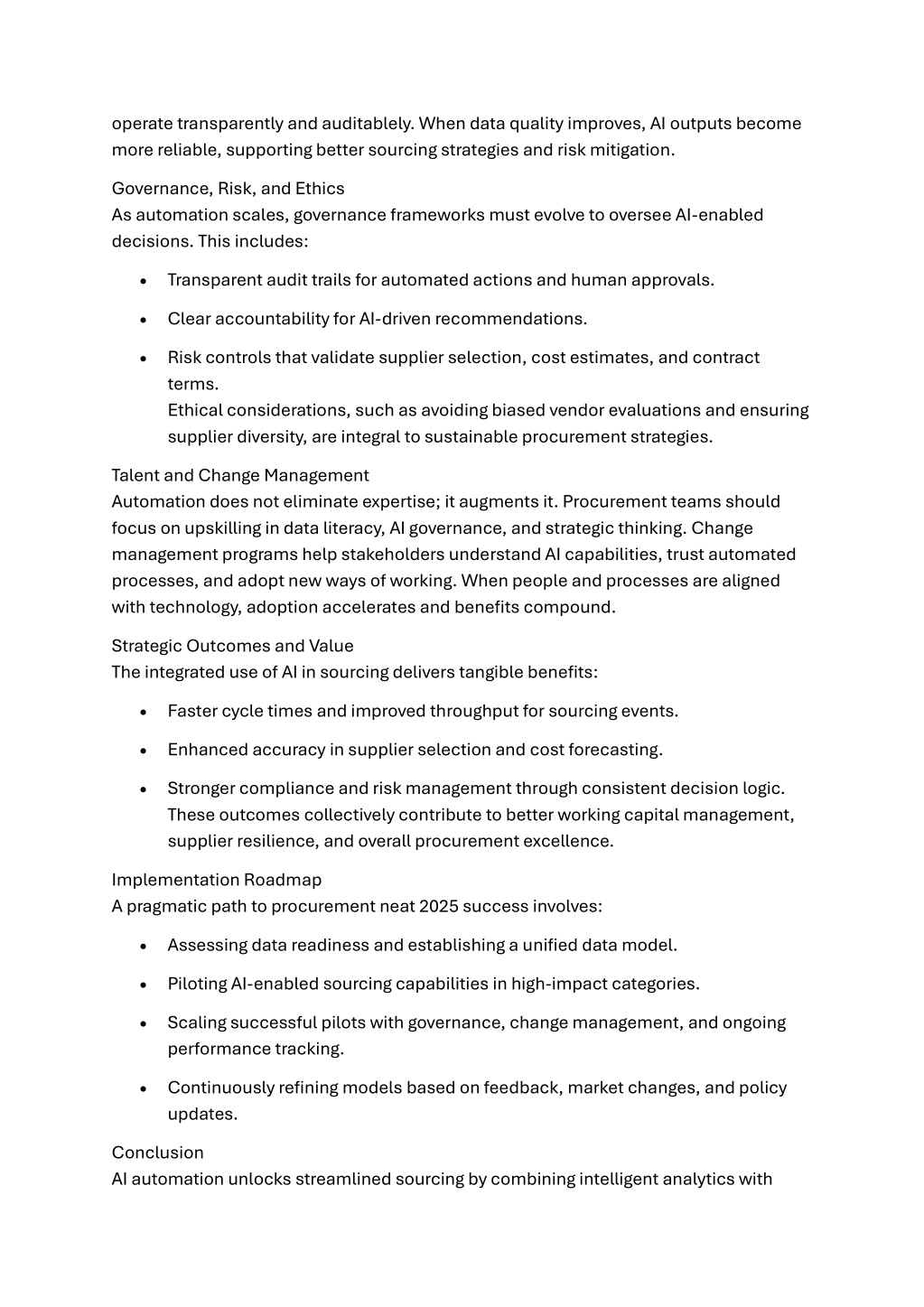 operate transparently and auditablely. When data quality improves, AI outputs become more reliable, supporting better sourcing strategies and risk mitigation. Governance, Risk, and Ethics As automation scales, governance frameworks must evolve to oversee AI-enabled decisions. This includes: •Transparent audit trails for automated actions and human approvals. •Clear accountability for AI-driven recommendations. •Risk controls that validate supplier selection, cost estimates, and contract terms. Ethical considerations, such as avoiding biased vendor evaluations and ensuring supplier diversity, are integral to sustainable procurement strategies. Talent and Change Management Automation does not eliminate expertise; it augments it. Procurement teams should focus on upskilling in data literacy, AI governance, and strategic thinking. Change management programs help stakeholders understand AI capabilities, trust automated processes, and adopt new ways of working. When people and processes are aligned with technology, adoption accelerates and benefits compound. Strategic Outcomes and Value The integrated use of AI in sourcing delivers tangible benefits: •Faster cycle times and improved throughput for sourcing events. •Enhanced accuracy in supplier selection and cost forecasting. •Stronger compliance and risk management through consistent decision logic. These outcomes collectively contribute to better working capital management, supplier resilience, and overall procurement excellence. Implementation Roadmap A pragmatic path to procurement neat 2025 success involves: •Assessing data readiness and establishing a unified data model. •Piloting AI-enabled sourcing capabilities in high-impact categories. •Scaling successful pilots with governance, change management, and ongoing performance tracking. •Continuously refining models based on feedback, market changes, and policy updates. Conclusion AI automation unlocks streamlined sourcing by combining intelligent analytics with