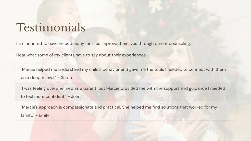 Testimonials I am honored to have helped many families improve their lives through parent counseling. Hear what some of my clients have to say about their experiences. "Marcie helped me understand my child's behavior and gave me the tools I needed to connect with them on a deeper level." - Sarah "I was feeling overwhelmed as a parent, but Marcie provided me with the support and guidance I needed to feel more confident." - John "Marcie's approach is compassionate and practical. She helped me find solutions that worked for my family." - Emily