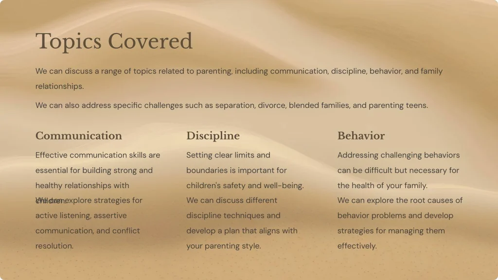 Topics Covered We can discuss a range of topics related to parenting, including communication, discipline, behavior, and family relationships. We can also address specific challenges such as separation, divorce, blended families, and parenting teens. Communication Discipline Behavior Effective communication skills are Setting clear limits and Addressing challenging behaviors essential for building strong and boundaries is important for can be difficult but necessary for healthy relationships with children's safety and well-being. the health of your family. children. We can explore strategies for We can discuss different We can explore the root causes of active listening, assertive discipline techniques and behavior problems and develop communication, and conflict develop a plan that aligns with strategies for managing them resolution. your parenting style. effectively.