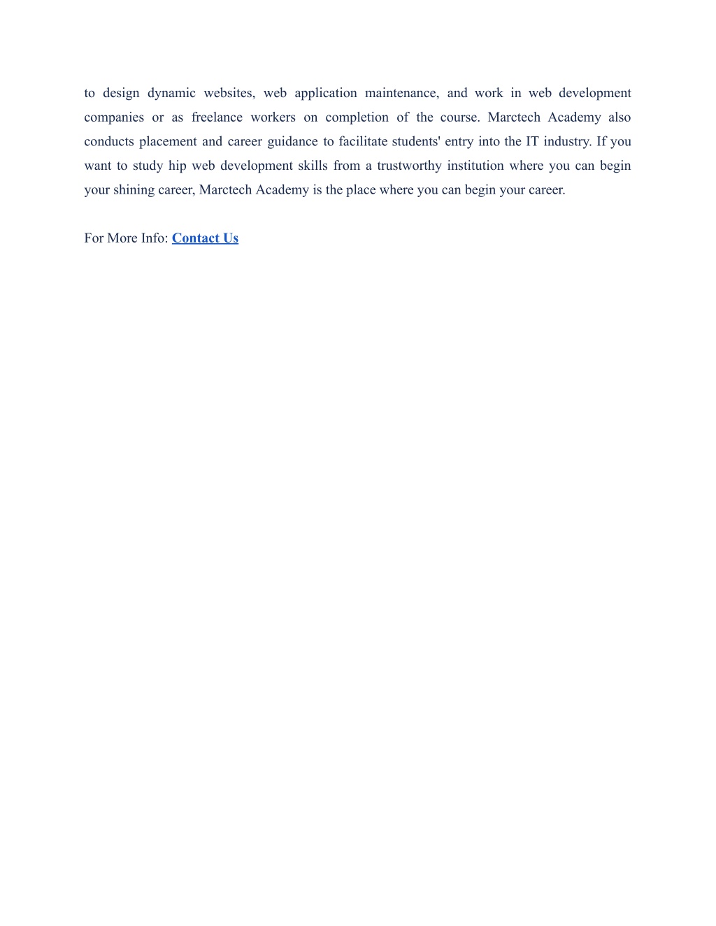 2. to design dynamic websites, web application maintenance, and work in web development companies or as freelance workers on completion of the course. Marctech Academy also conducts placement and career guidance to facilitate students' entry into the IT industry. If you want to study hip web development skills from a trustworthy institution where you can begin your shining career, Marctech Academy is the place where you can begin your career. For More Info: Contact Us