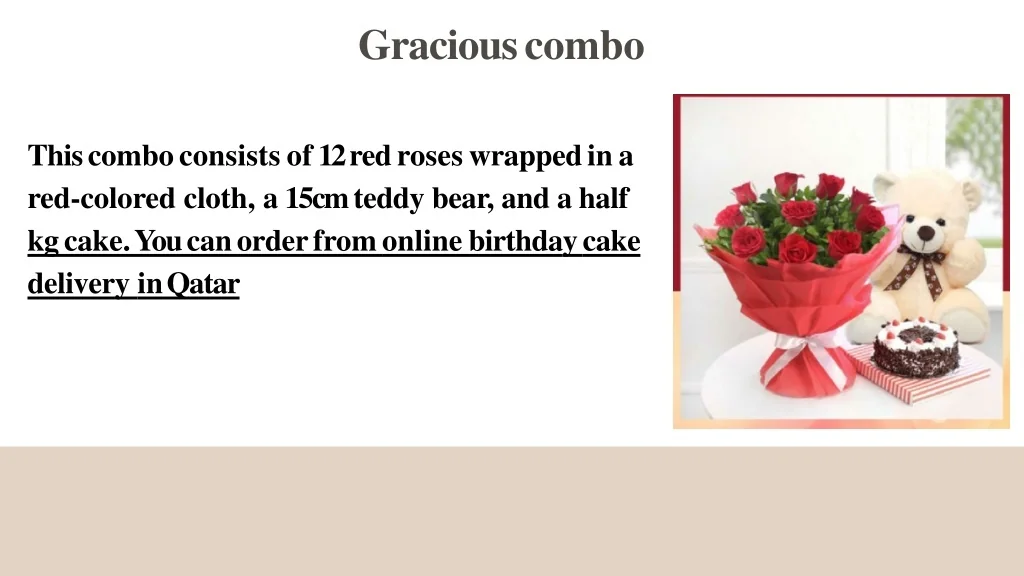 Graciouscombo Thiscomboconsistsof12redroseswrappedina red-colored cloth, a 15cm teddy bear, and a half kgcake.Youcanorderfromonlinebirthdaycake delivery inQatar