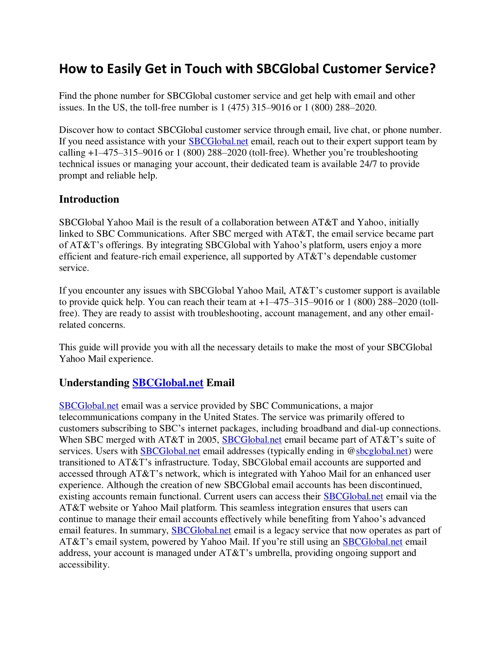 How to Easily Get in Touch with SBCGlobal Customer Service? Find the phone number for SBCGlobal customer service and get help with email and other issues. In the US, the toll-free number is 1 (475) 315–9016 or 1 (800) 288–2020. Discover how to contact SBCGlobal customer service through email, live chat, or phone number. If you need assistance with your SBCGlobal.net email, reach out to their expert support team by calling +1–475–315–9016 or 1 (800) 288–2020 (toll-free). Whether you’re troubleshooting technical issues or managing your account, their dedicated team is available 24/7 to provide prompt and reliable help. Introduction SBCGlobal Yahoo Mail is the result of a collaboration between AT&T and Yahoo, initially linked to SBC Communications. After SBC merged with AT&T, the email service became part of AT&T’s offerings. By integrating SBCGlobal with Yahoo’s platform, users enjoy a more efficient and feature-rich email experience, all supported by AT&T’s dependable customer service. If you encounter any issues with SBCGlobal Yahoo Mail, AT&T’s customer support is available to provide quick help. You can reach their team at +1–475–315–9016 or 1 (800) 288–2020 (toll- free). They are ready to assist with troubleshooting, account management, and any other email- related concerns. This guide will provide you with all the necessary details to make the most of your SBCGlobal Yahoo Mail experience. Understanding SBCGlobal.net Email SBCGlobal.net email was a service provided by SBC Communications, a major telecommunications company in the United States. The service was primarily offered to customers subscribing to SBC’s internet packages, including broadband and dial-up connections. When SBC merged with AT&T in 2005, SBCGlobal.net email became part of AT&T’s suite of services. Users with SBCGlobal.net email addresses (typically ending in @sbcglobal.net) were transitioned to AT&T’s infrastructure. Today, SBCGlobal email accounts are supported and accessed through AT&T’s network, which is integrated with Yahoo Mail for an enhanced user experience. Although the creation of new SBCGlobal email accounts has been discontinued, existing accounts remain functional. Current users can access their SBCGlobal.net email via the AT&T website or Yahoo Mail platform. This seamless integration ensures that users can continue to manage their email accounts effectively while benefiting from Yahoo’s advanced email features. In summary, SBCGlobal.net email is a legacy service that now operates as part of AT&T’s email system, powered by Yahoo Mail. If you’re still using an SBCGlobal.net email address, your account is managed under AT&T’s umbrella, providing ongoing support and accessibility.