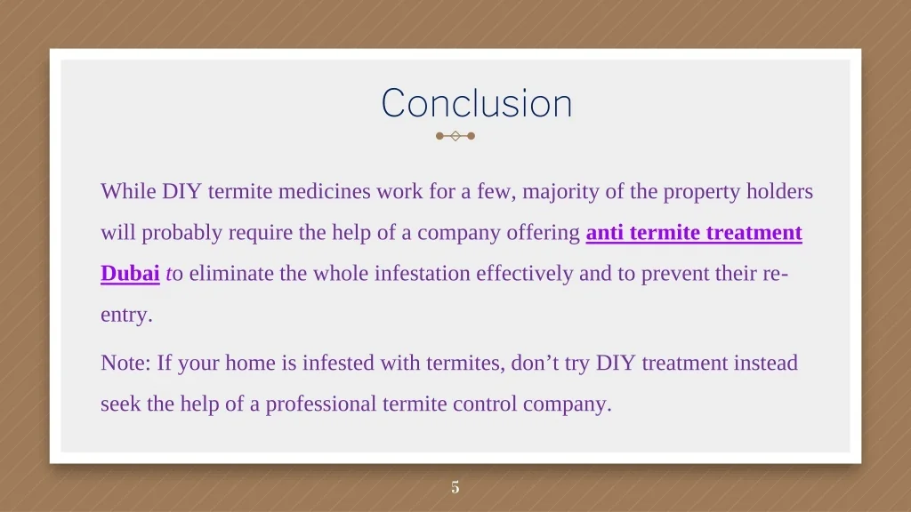 Conclusion While DIY termite medicines work for a few, majority of the property holders will probably require the help of a company offering anti termite treatment Dubaito eliminate the whole infestation effectively and to prevent their re-entry. Note: If your home is infested with termites, don’t try DIY treatment instead seek the help of a professional termite control company.