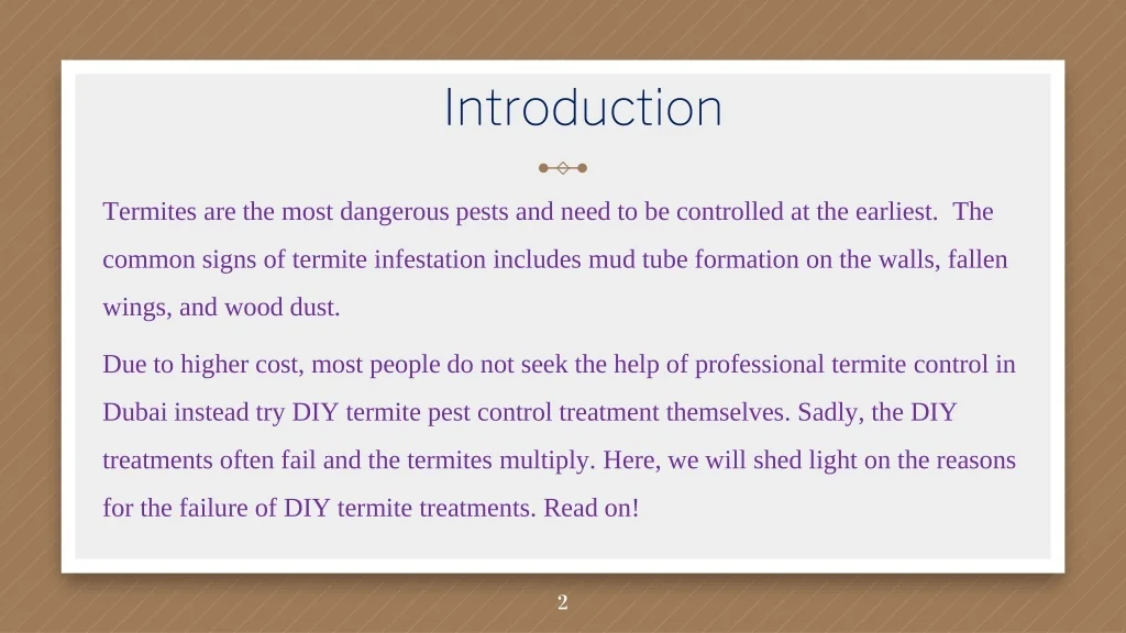 Introduction Termites are the most dangerous pests and need to be controlled at the earliest. The common signs of termite infestation includes mud tube formation on the walls, fallen wings, and wood dust. Due to higher cost, most people do not seek the help of professional termite control in Dubai instead try DIY termite pest control treatment themselves. Sadly, the DIY treatments often fail and the termites multiply. Here, we will shed light on the reasons for the failure of DIY termite treatments. Read on!