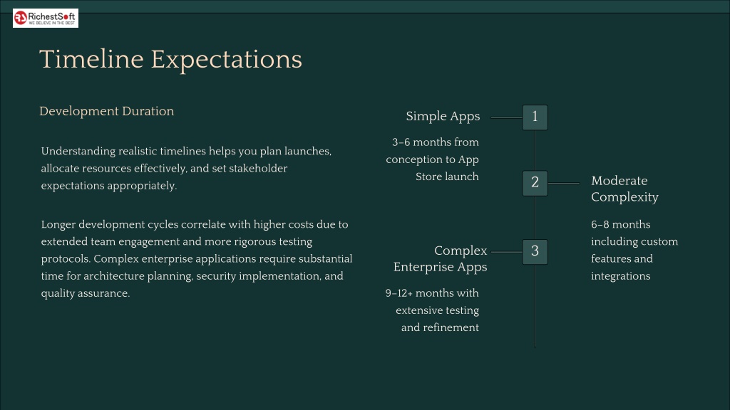 Timeline Expectations Development Duration Simple Apps 1 3–6 months from conception to App Store launch Understanding realistic timelines helps you plan launches, allocate resources effectively, and set stakeholder expectations appropriately. Moderate Complexity 2 Longer development cycles correlate with higher costs due to extended team engagement and more rigorous testing protocols. Complex enterprise applications require substantial time for architecture planning, security implementation, and quality assurance. 6–8 months including custom features and integrations Complex Enterprise Apps 3 9–12+ months with extensive testing and refinement