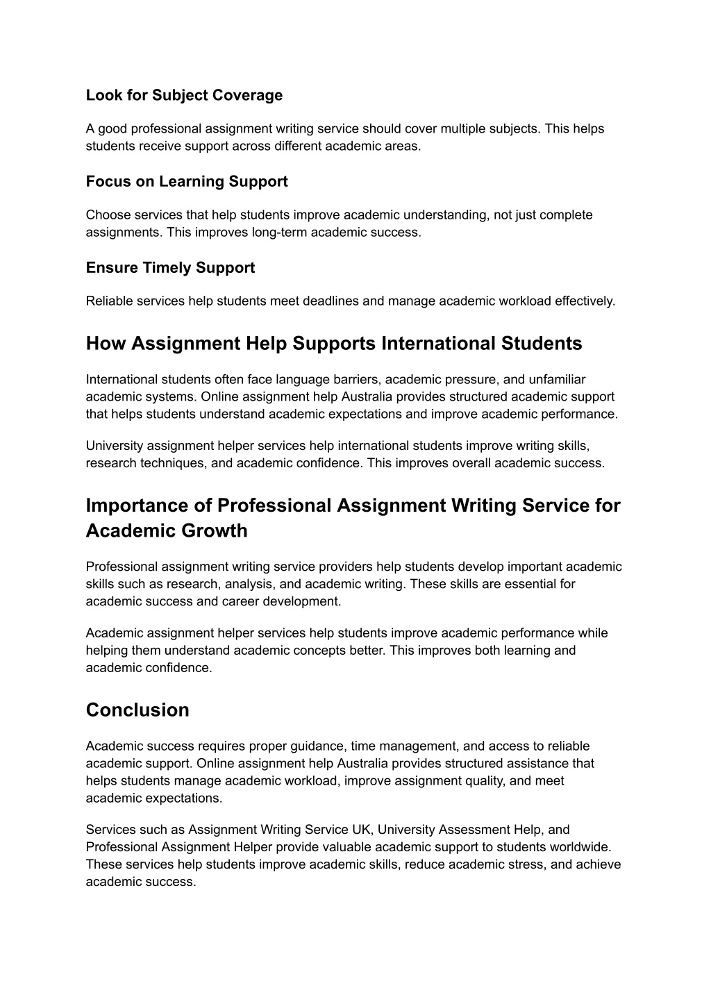 Look for Subject Coverage A good professional assignment writing service should cover multiple subjects. This helps students receive support across different academic areas. Focus on Learning Support Choose services that help students improve academic understanding, not just complete assignments. This improves long-term academic success. Ensure Timely Support Reliable services help students meet deadlines and manage academic workload effectively. How Assignment Help Supports International Students International students often face language barriers, academic pressure, and unfamiliar academic systems. Online assignment help Australia provides structured academic support that helps students understand academic expectations and improve academic performance. University assignment helper services help international students improve writing skills, research techniques, and academic confidence. This improves overall academic success. Importance of Professional Assignment Writing Service for Academic Growth Professional assignment writing service providers help students develop important academic skills such as research, analysis, and academic writing. These skills are essential for academic success and career development. Academic assignment helper services help students improve academic performance while helping them understand academic concepts better. This improves both learning and academic confidence. Conclusion Academic success requires proper guidance, time management, and access to reliable academic support. Online assignment help Australia provides structured assistance that helps students manage academic workload, improve assignment quality, and meet academic expectations. Services such as Assignment Writing Service UK, University Assessment Help, and Professional Assignment Helper provide valuable academic support to students worldwide. These services help students improve academic skills, reduce academic stress, and achieve academic success.