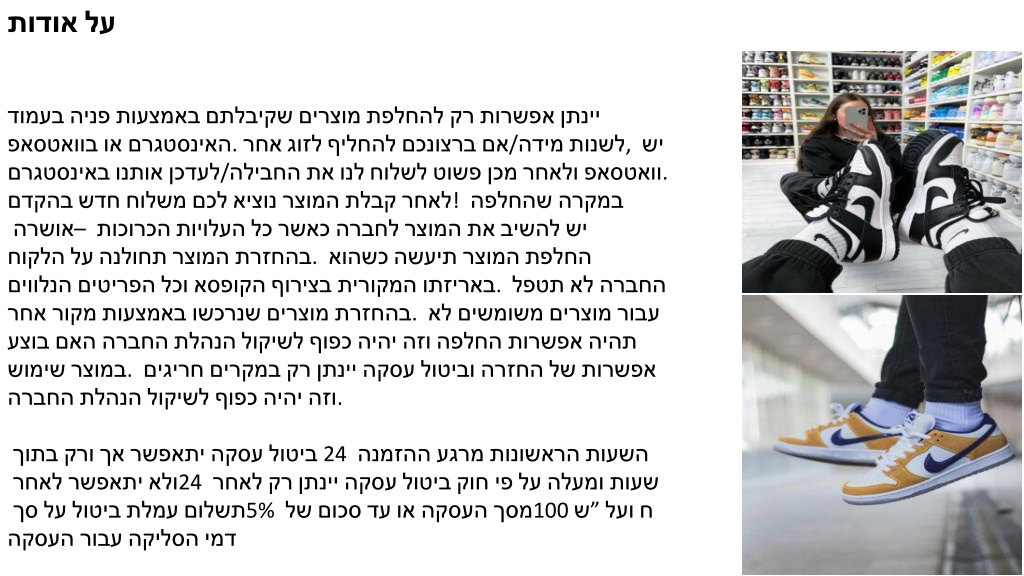 על אודות יינתן אפשרות רק להחלפת מוצרים שקיבלתם באמצעות פניה בעמוד האינסטגרם או בוואטסאפ. אם ברצונכם להחליף לזוג אחר/לשנות מידה, יש לעדכן אותנו באינסטגרם/וואטסאפ ולאחר מכן פשוט לשלוח לנו את החבילה. לאחר קבלת המוצר נוציא לכם משלוח חדש בהקדם! במקרה שהחלפה אושרה – יש להשיב את המוצר לחברה כאשר כל העלויות הכרוכות בהחזרת המוצר תחולנה על הלקוח. החלפת המוצר תיעשה כשהוא באריזתו המקורית בצירוף הקופסא וכל הפריטים הנלווים. החברה לא תטפל בהחזרת מוצרים שנרכשו באמצעות מקור אחר. עבור מוצרים משומשים לא תהיה אפשרות החלפה וזה יהיה כפוף לשיקול הנהלת החברה האם בוצע במוצר שימוש. אפשרות של החזרה וביטול עסקה יינתן רק במקרים חריגים וזה יהיה כפוף לשיקול הנהלת החברה. ביטול עסקה יתאפשר אך ורק בתוך 24 השעות הראשונות מרגע ההזמנה ולא יתאפשר לאחר 24 שעות ומעלה על פי חוק ביטול עסקה יינתן רק לאחר תשלום עמלת ביטול על סך 5% מסך העסקה או עד סכום של 100 ש”ח ועל דמי הסליקה עבור העסקה