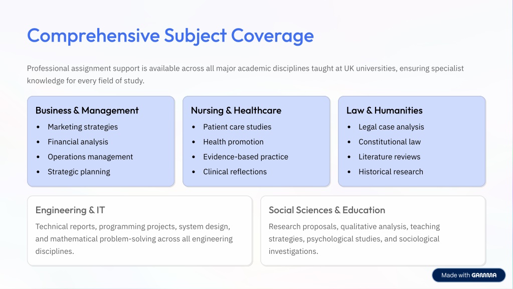Comprehensive Subject Coverage Professional assignment support is available across all major academic disciplines taught at UK universities, ensuring specialist knowledge for every field of study. Business & Management Nursing & Healthcare Law & Humanities Marketing strategies Patient care studies Legal case analysis Financial analysis Health promotion Constitutional law Operations management Evidence-based practice Literature reviews Strategic planning Clinical reflections Historical research Engineering & IT Social Sciences & Education Technical reports, programming projects, system design, and mathematical problem-solving across all engineering disciplines. Research proposals, qualitative analysis, teaching strategies, psychological studies, and sociological investigations.