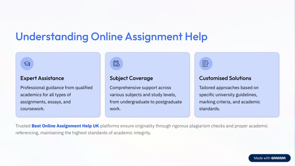 Understanding Online Assignment Help Expert Assistance Subject Coverage Customised Solutions Professional guidance from qualified academics for all types of assignments, essays, and coursework. Comprehensive support across various subjects and study levels, from undergraduate to postgraduate work. Tailored approaches based on specific university guidelines, marking criteria, and academic standards. Trusted Best Online Assignment Help UK platforms ensure originality through rigorous plagiarism checks and proper academic referencing, maintaining the highest standards of academic integrity.