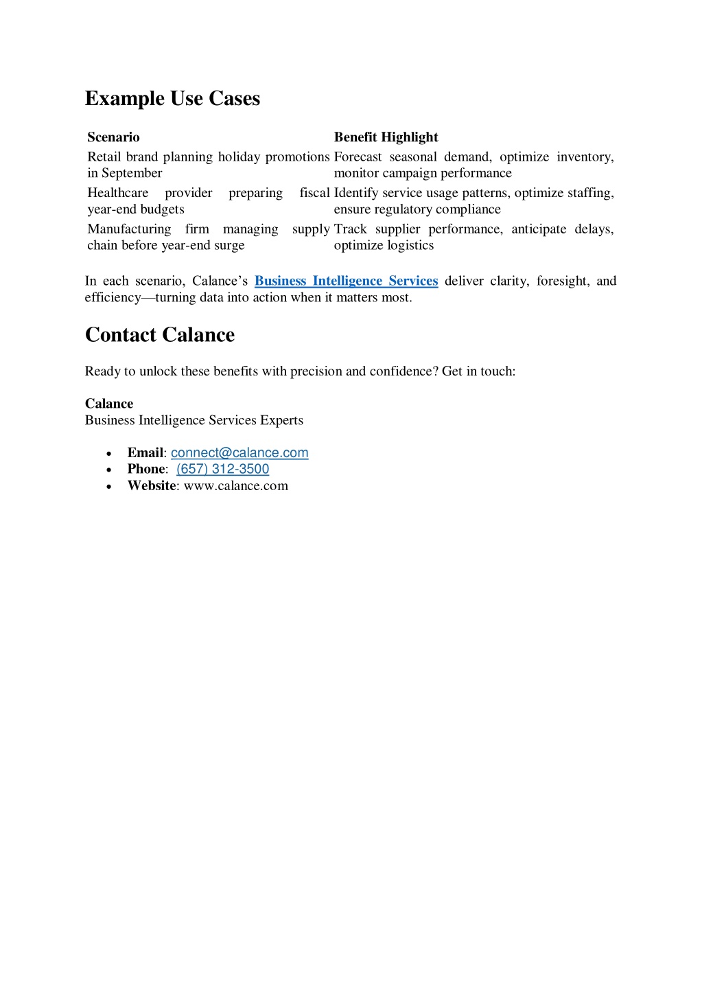 Example Use Cases Scenario Retail brand planning holiday promotions in September Healthcare provider year-end budgets Manufacturing firm managing supply chain before year-end surge Benefit Highlight Forecast seasonal demand, optimize inventory, monitor campaign performance Identify service usage patterns, optimize staffing, ensure regulatory compliance Track supplier performance, anticipate delays, optimize logistics preparing fiscal In each scenario, Calance’s Business Intelligence Services deliver clarity, foresight, and efficiency—turning data into action when it matters most. Contact Calance Ready to unlock these benefits with precision and confidence? Get in touch: Calance Business Intelligence Services Experts Email: connect@calance.com Phone: (657) 312-3500 Website: www.calance.com