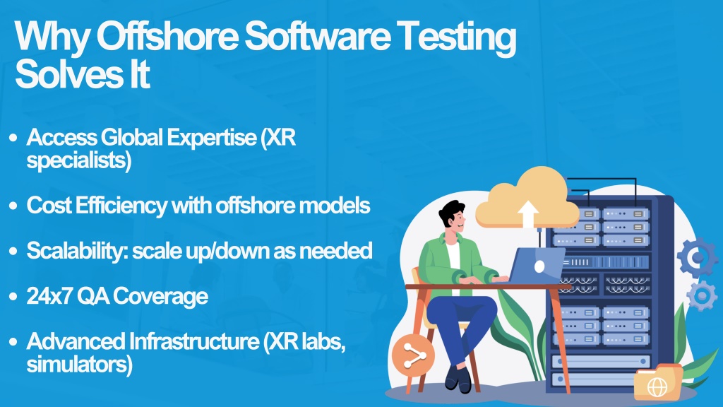 Why Offshore Software Testing Solves It Access Global Expertise (XR specialists) Cost Efficiency with offshore models Scalability: scale up/down as needed 24x7 QA Coverage Advanced Infrastructure (XR labs, simulators)