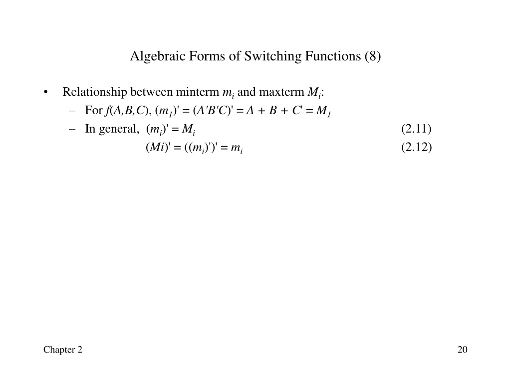 Algebraic Forms of Switching Functions (8) • Relationship between minterm mi and maxterm Mi: • For f(A,B,C), (m1)' = (A'B'C)' = A + B + C' = M1 • In general, (mi)' = Mi (2.11) (Mi)' = ((mi)')' = mi (2.12) Chapter 2