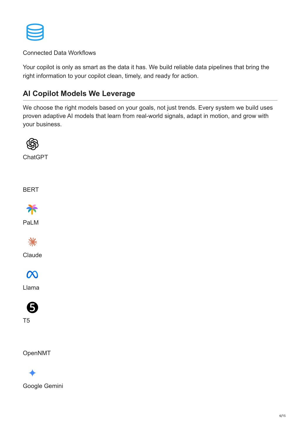 6. Connected Data Workflows Your copilot is only as smart as the data it has. We build reliable data pipelines that bring the right information to your copilot clean, timely, and ready for action. AI Copilot Models We Leverage We choose the right models based on your goals, not just trends. Every system we build uses proven adaptive AI models that learn from real-world signals, adapt in motion, and grow with your business. ChatGPT BERT PaLM Claude Llama T5 OpenNMT Google Gemini 6/15