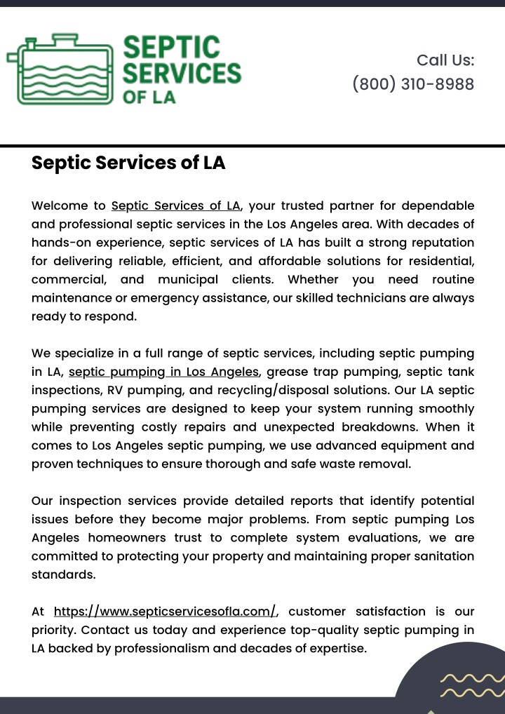 Call Us: (800) 310-8988 Septic Services of LA Welcome to Septic Services of LA, your trusted partner for dependable and professional septic services in the Los Angeles area. With decades of hands-on experience, septic services of LA has built a strong reputation for delivering reliable, efficient, and affordable solutions for residential, commercial, and municipal clients. Whether you need routine maintenance or emergency assistance, our skilled technicians are always ready to respond. We specialize in a full range of septic services, including septic pumping in LA, septic pumping in Los Angeles, grease trap pumping, septic tank inspections, RV pumping, and recycling/disposal solutions. Our LA septic pumping services are designed to keep your system running smoothly while preventing costly repairs and unexpected breakdowns. When it comes to Los Angeles septic pumping, we use advanced equipment and proven techniques to ensure thorough and safe waste removal. Our inspection services provide detailed reports that identify potential issues before they become major problems. From septic pumping Los Angeles homeowners trust to complete system evaluations, we are committed to protecting your property and maintaining proper sanitation standards. At https://www.septicservicesofla.com/, customer satisfaction is our priority. Contact us today and experience top-quality septic pumping in LA backed by professionalism and decades of expertise.