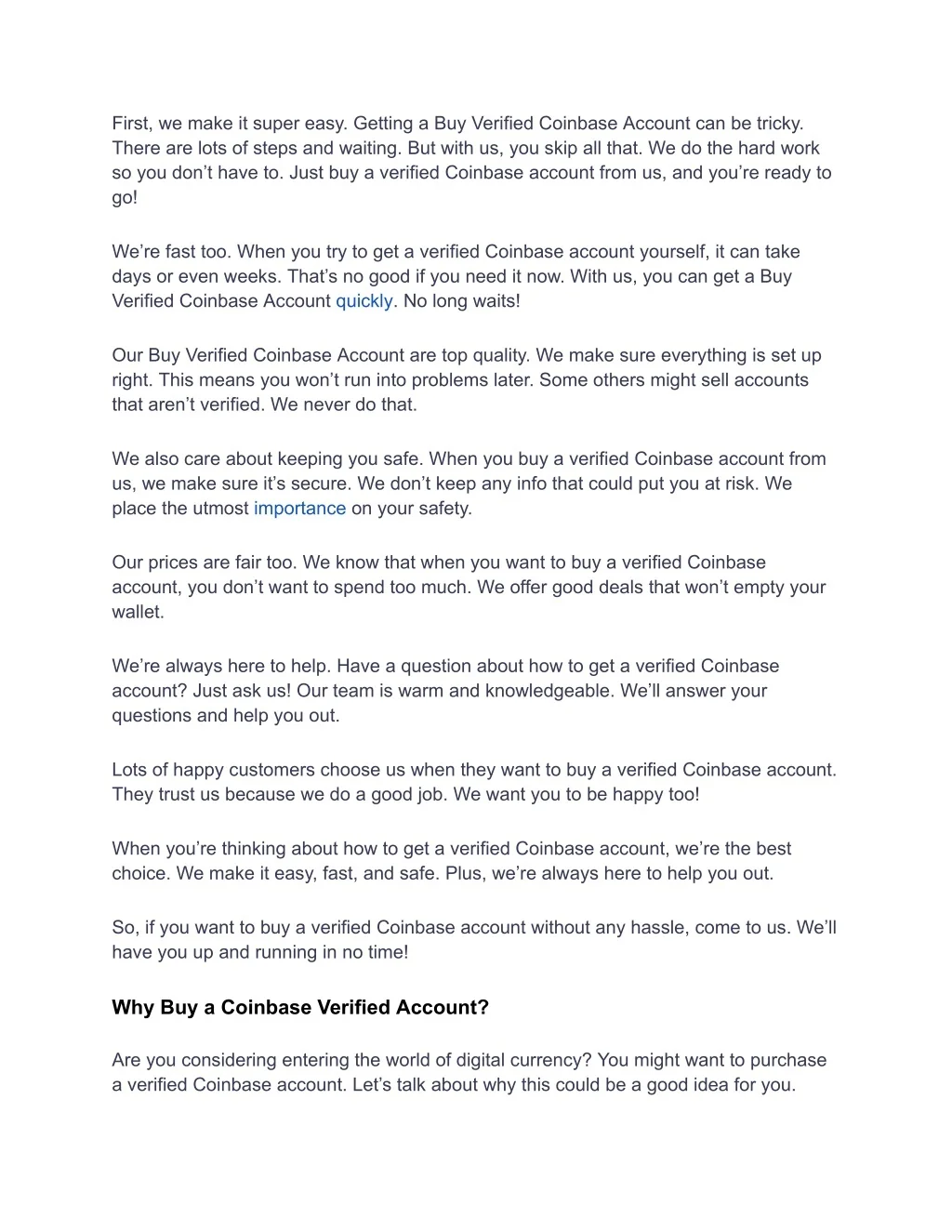 Why Do People Trust Us When They Buy Verified Coinbase Accounts? Let’s talk about why folks choose to buy verified Coinbase accounts from us. We’re proud that so many people trust us, and here’s why: 1. Quick and Easy: When you buy verified Coinbase accounts from us, you save time. No need to wait for days to start trading. Just get your account and jump right in! 2. Already Checked: We make sure every account is good to go. When you buy verified Coinbase accounts, you know they’ve been approved buy Coinbase already. 3. Safe to Use: We take safety very seriously. People trust us because when they buy verified Coinbase accounts from us, they know it’s secure. 4. Great Help: If you need any help when you buy verified Coinbase accounts, we’re here for you. Our team is friendly and quick to respond. 5. Good Prices: We offer fair prices when you want to buy verified Coinbase accounts. People like that they get good value for their money.