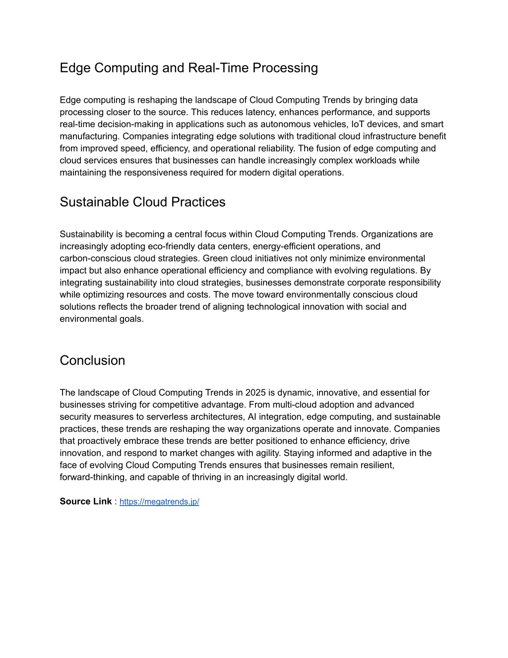 Edge Computing and Real-Time Processing Edge computing is reshaping the landscape of Cloud Computing Trends by bringing data processing closer to the source. This reduces latency, enhances performance, and supports real-time decision-making in applications such as autonomous vehicles, IoT devices, and smart manufacturing. Companies integrating edge solutions with traditional cloud infrastructure benefit from improved speed, efficiency, and operational reliability. The fusion of edge computing and cloud services ensures that businesses can handle increasingly complex workloads while maintaining the responsiveness required for modern digital operations. Sustainable Cloud Practices Sustainability is becoming a central focus within Cloud Computing Trends. Organizations are increasingly adopting eco-friendly data centers, energy-efficient operations, and carbon-conscious cloud strategies. Green cloud initiatives not only minimize environmental impact but also enhance operational efficiency and compliance with evolving regulations. By integrating sustainability into cloud strategies, businesses demonstrate corporate responsibility while optimizing resources and costs. The move toward environmentally conscious cloud solutions reflects the broader trend of aligning technological innovation with social and environmental goals. Conclusion The landscape of Cloud Computing Trends in 2025 is dynamic, innovative, and essential for businesses striving for competitive advantage. From multi-cloud adoption and advanced security measures to serverless architectures, AI integration, edge computing, and sustainable practices, these trends are reshaping the way organizations operate and innovate. Companies that proactively embrace these trends are better positioned to enhance efficiency, drive innovation, and respond to market changes with agility. Staying informed and adaptive in the face of evolving Cloud Computing Trends ensures that businesses remain resilient, forward-thinking, and capable of thriving in an increasingly digital world. Source Link : https://megatrends.jp/