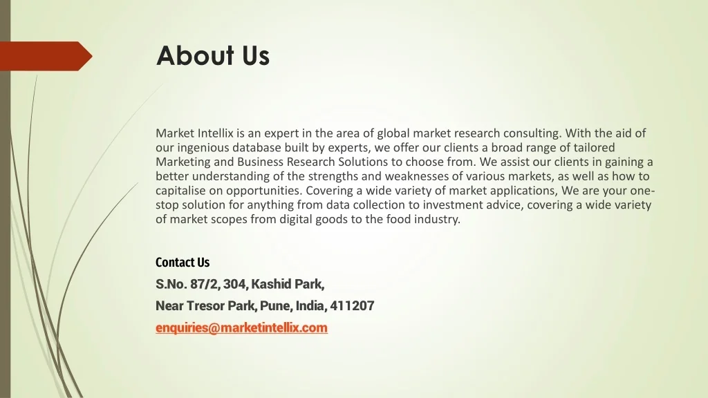 About Us Market Intellix is an expert in the area of global market research consulting. With the aid of our ingenious database built by experts, we offer our clients a broad range of tailored Marketing and Business Research Solutions to choose from. We assist our clients in gaining a better understanding of the strengths and weaknesses of various markets, as well as how to capitalise on opportunities. Covering a wide variety of market applications, We are your one-stop solution for anything from data collection to investment advice, covering a wide variety of market scopes from digital goods to the food industry. Contact Us S.No. 87/2, 304, Kashid Park, Near Tresor Park, Pune, India, 411207 enquiries@marketintellix.com