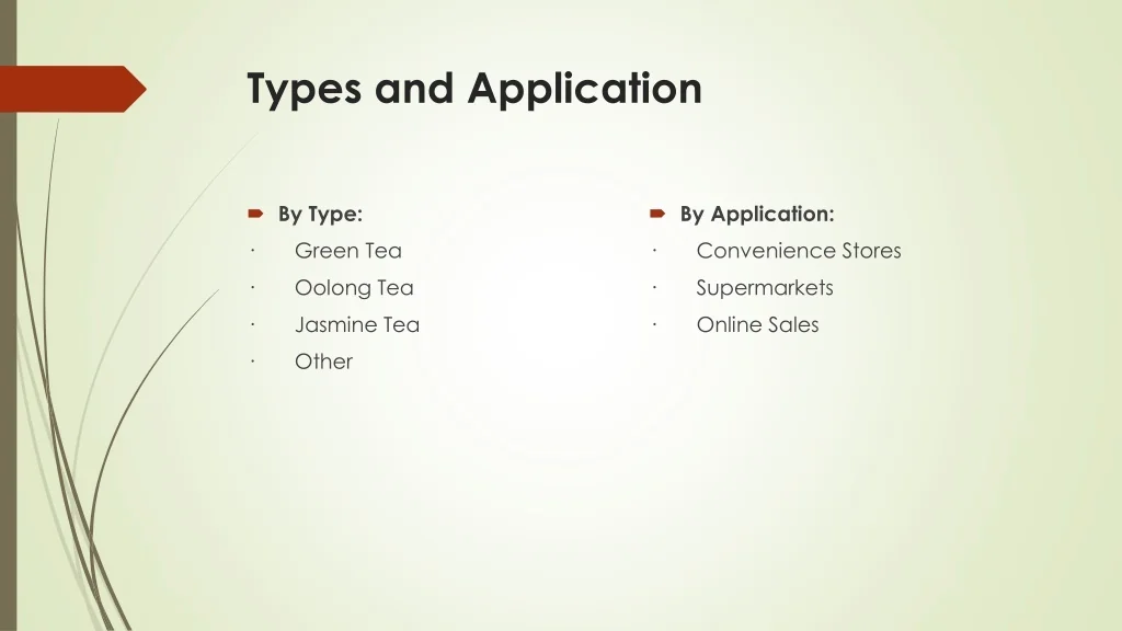 Types and Application • By Type: · Green Tea · Oolong Tea · Jasmine Tea · Other • By Application: · Convenience Stores · Supermarkets · Online Sales