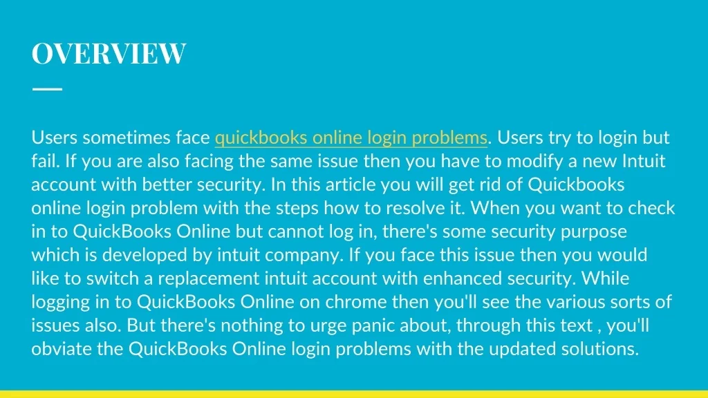 OVERVIEW Users sometimes face quickbooks online login problems. Users try to login but fail. If you are also facing the same issue then you have to modify a new Intuit account with better security. In this article you will get rid of Quickbooks online login problem with the steps how to resolve it. When you want to check in to QuickBooks Online but cannot log in, there's some security purpose which is developed by intuit company. If you face this issue then you would like to switch a replacement intuit account with enhanced security. While logging in to QuickBooks Online on chrome then you'll see the various sorts of issues also. But there's nothing to urge panic about, through this text , you'll obviate the QuickBooks Online login problems with the updated solutions.
