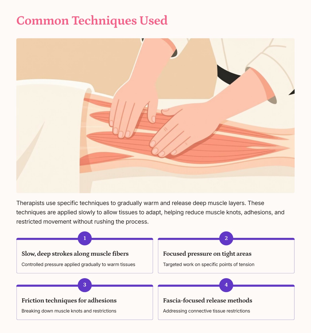 Common Techniques Used Therapists use specific techniques to gradually warm and release deep muscle layers. These techniques are applied slowly to allow tissues to adapt, helping reduce muscle knots, adhesions, and restricted movement without rushing the process. 1 2 Slow, deep strokes along muscle fibers Focused pressure on tight areas Controlled pressure applied gradually to warm tissues Targeted work on specific points of tension 3 4 Friction techniques for adhesions Fascia-focused release methods Breaking down muscle knots and restrictions Addressing connective tissue restrictions