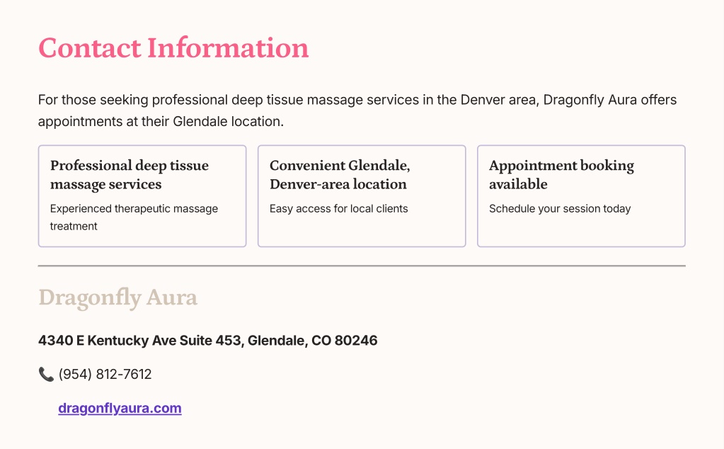Contact Information For those seeking professional deep tissue massage services in the Denver area, Dragonfly Aura offers appointments at their Glendale location. Professional deep tissue massage services Convenient Glendale, Denver-area location Appointment booking available Experienced therapeutic massage treatment Easy access for local clients Schedule your session today Dragonfly Aura 4340 E Kentucky Ave Suite 453, Glendale, CO 80246 ? (954) 812-7612 dragonflyaura.com