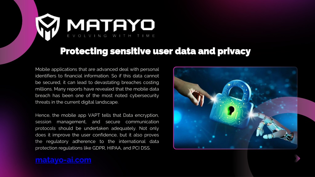 4. Protecting sensitive user data and privacy • Mobile applications that are advanced deal with personal identifiers to financial information. So if this data cannot be secured, it can lead to devastating breaches costing millions. Many reports have revealed that the mobile data breach has been one of the most noted cybersecurity threats in the current digital landscape. • Hence, the mobile app VAPT tells that Data encryption, session management, and secure communication protocols should be undertaken adequately. Not only does it improve the user confidence, but it also proves the regulatory adherence to the international data protection regulations like GDPR, HIPAA, and PCI DSS. matayo-ai.com
