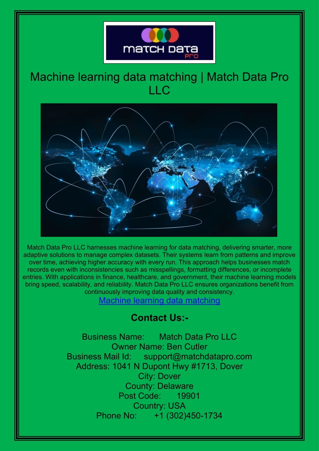 1. Machine learning data matching | Match Data Pro LLC Match Data Pro LLC harnesses machine learning for data matching, delivering smarter, more adaptive solutions to manage complex datasets. Their systems learn from patterns and improve over time, achieving higher accuracy with every run. This approach helps businesses match records even with inconsistencies such as misspellings, formatting differences, or incomplete entries. With applications in finance, healthcare, and government, their machine learning models bring speed, scalability, and reliability. Match Data Pro LLC ensures organizations benefit from continuously improving data quality and consistency. Machine learning data matching Contact Us:- Business Name: Owner Name: Ben Cutler Business Mail Id: Address: 1041 N Dupont Hwy #1713, Dover City: Dover County: Delaware Post Code: Country: USA Phone No: +1 (302)450-1734 Match Data Pro LLC support@matchdatapro.com 19901