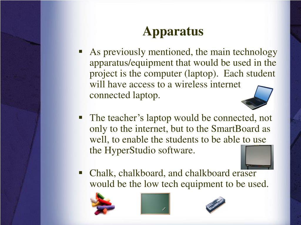 Apparatus • As previously mentioned, the main technology apparatus/equipment that would be used in the project is the computer (laptop). Each student will have access to a wireless internet connected laptop. • The teacher’s laptop would be connected, not only to the internet, but to the SmartBoard as well, to enable the students to be able to use the HyperStudio software. • Chalk, chalkboard, and chalkboard eraser would be the low tech equipment to be used.