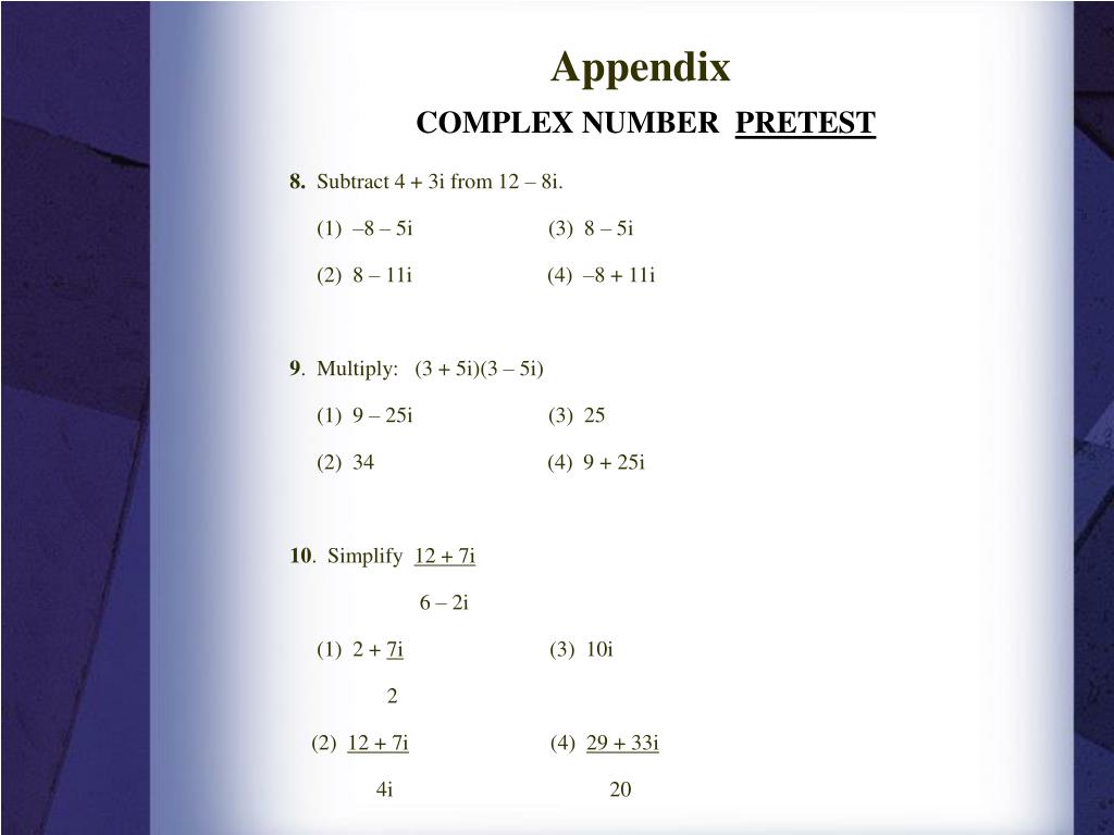 Appendix COMPLEX NUMBER PRETEST 8. Subtract 4 + 3i from 12 – 8i. (1) –8 – 5i (3) 8 – 5i (2) 8 – 11i (4) –8 + 11i 9. Multiply: (3 + 5i)(3 – 5i) (1) 9 – 25i (3) 25 (2) 34 (4) 9 + 25i 10. Simplify 12 + 7i 6 – 2i (1) 2 + 7i (3) 10i 2 (2) 12 + 7i (4) 29 + 33i 4i 20