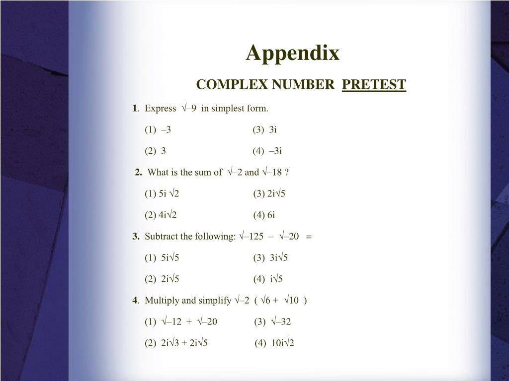 Appendix COMPLEX NUMBER PRETEST 1. Express √–9 in simplest form. (1) –3 (3) 3i (2) 3 (4) –3i 2. What is the sum of √–2 and √–18 ? (1) 5i √2 (3) 2i√5 (2) 4i√2 (4) 6i 3. Subtract the following: √–125 – √–20 = (1) 5i√5 (3) 3i√5 (2) 2i√5 (4) i√5 4. Multiply and simplify √–2 ( √6 + √10 ) (1) √–12 + √–20 (3) √–32 (2) 2i√3 + 2i√5 (4) 10i√2