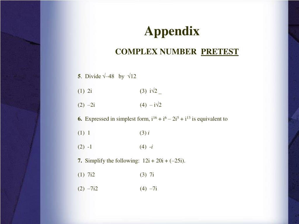 Appendix COMPLEX NUMBER PRETEST 5. Divide √–48 by √12 (1) 2i (3) i√2 _ (2) –2i (4) – i√2 6. Expressed in simplest form, i16 + i6 – 2i5 + i13 is equivalent to (1) 1 (3) i (2) -1 (4) -i 7. Simplify the following: 12i + 20i + (–25i). (1) 7i2 (3) 7i (2)–7i2(4) –7i