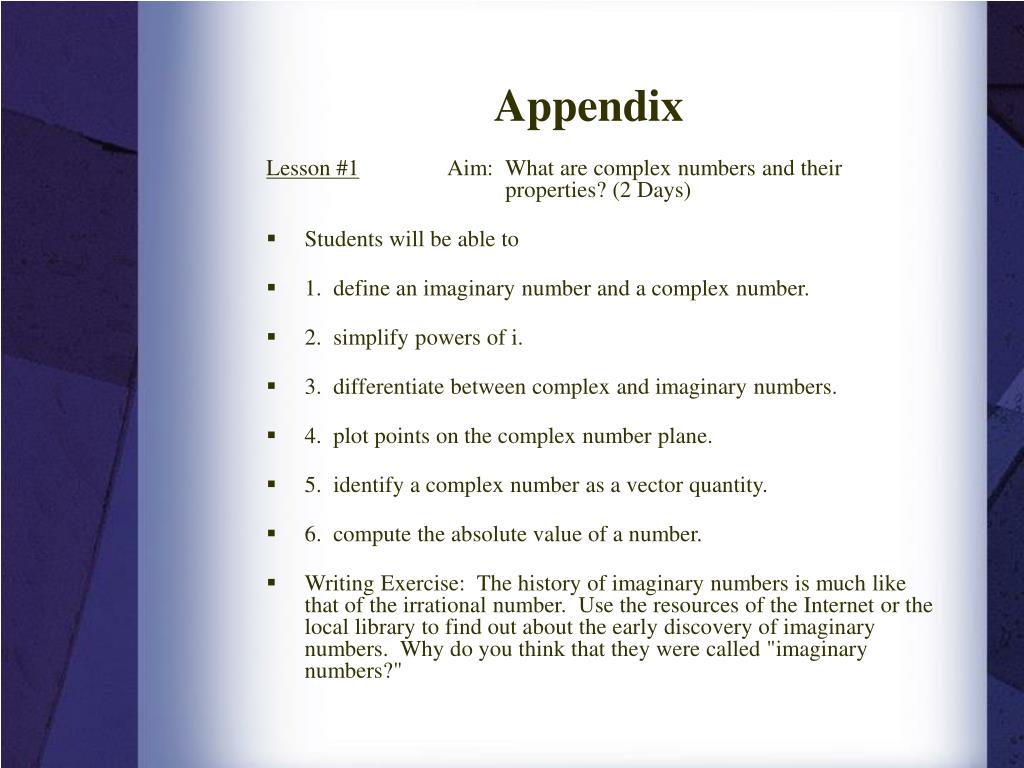 Appendix Lesson #1 Aim: What are complex numbers and their properties? (2 Days) • Students will be able to • 1. define an imaginary number and a complex number. • 2. simplify powers of i. • 3. differentiate between complex and imaginary numbers. • 4. plot points on the complex number plane. • 5. identify a complex number as a vector quantity. • 6. compute the absolute value of a number. • Writing Exercise: The history of imaginary numbers is much like that of the irrational number. Use the resources of the Internet or the local library to find out about the early discovery of imaginary numbers. Why do you think that they were called "imaginary numbers?"