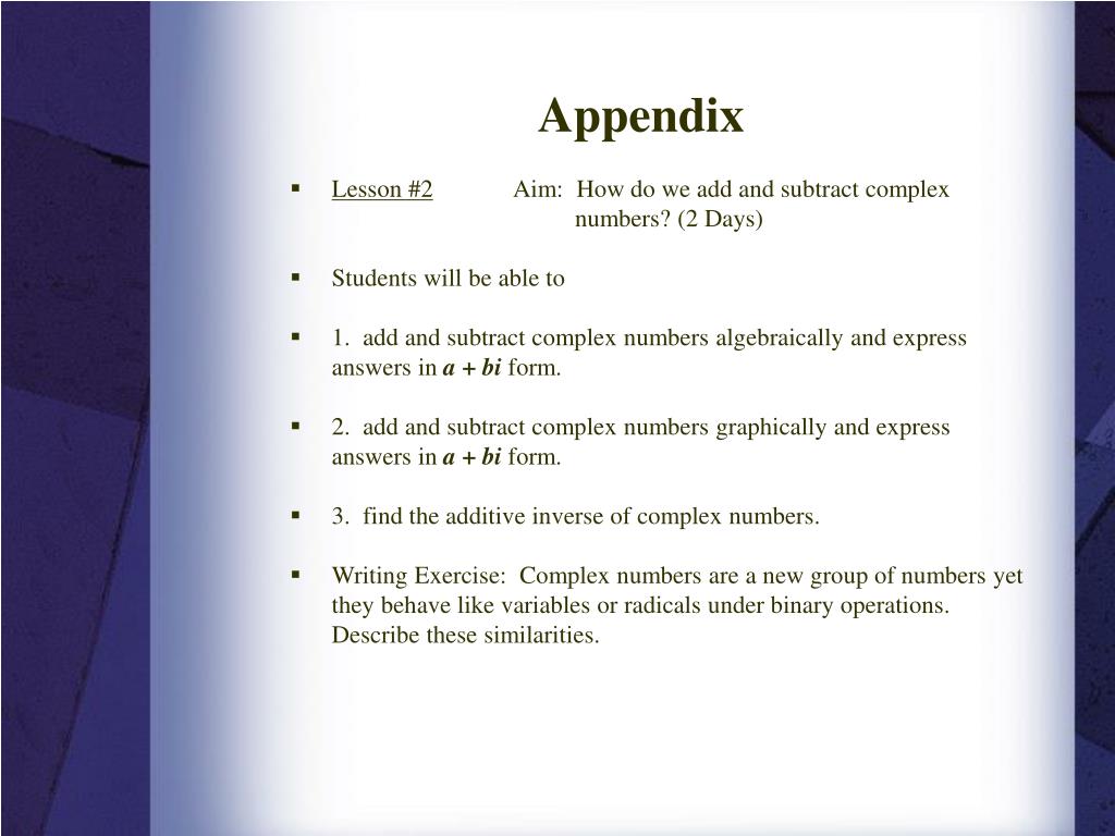 Appendix • Lesson #2 Aim: How do we add and subtract complex numbers? (2 Days) • Students will be able to • 1. add and subtract complex numbers algebraically and express answers in a + bi form. • 2. add and subtract complex numbers graphically and express answers in a + bi form. • 3. find the additive inverse of complex numbers. • Writing Exercise: Complex numbers are a new group of numbers yet they behave like variables or radicals under binary operations. Describe these similarities.