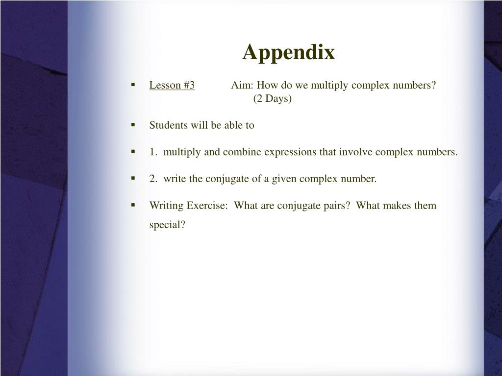 Appendix • Lesson #3 Aim: How do we multiply complex numbers? (2 Days) • Students will be able to • 1. multiply and combine expressions that involve complex numbers. • 2. write the conjugate of a given complex number. • Writing Exercise: What are conjugate pairs? What makes them special?