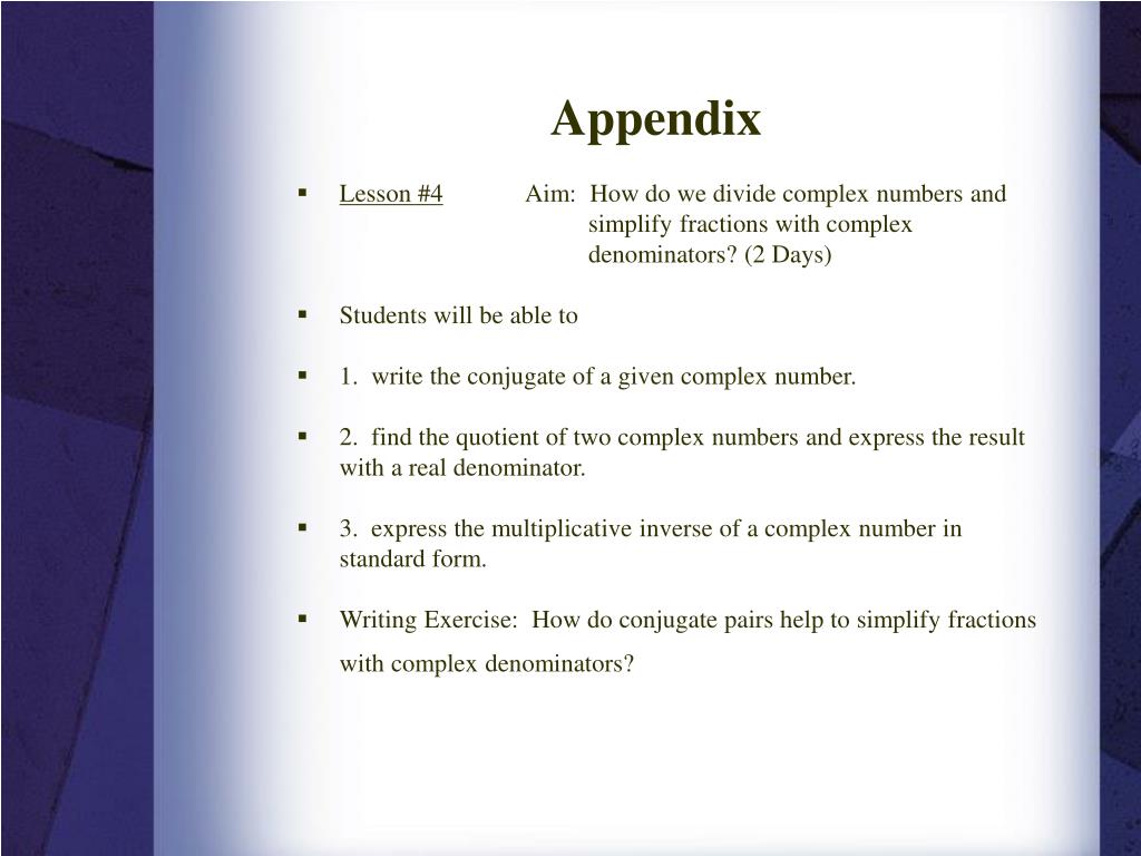 Appendix • Lesson #4 Aim: How do we divide complex numbers and simplify fractions with complex denominators? (2 Days) • Students will be able to • 1. write the conjugate of a given complex number. • 2. find the quotient of two complex numbers and express the result with a real denominator. • 3. express the multiplicative inverse of a complex number in standard form. • Writing Exercise: How do conjugate pairs help to simplify fractions with complex denominators?