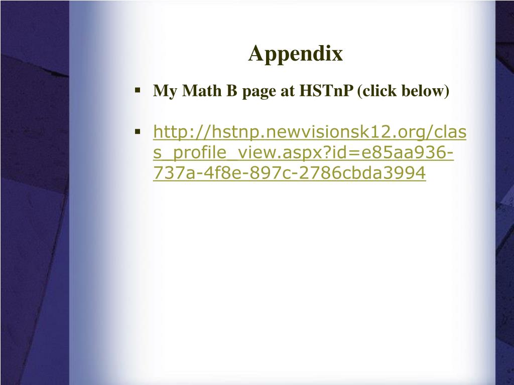 Appendix • My Math B page at HSTnP (click below) • http://hstnp.newvisionsk12.org/class_profile_view.aspx?id=e85aa936-737a-4f8e-897c-2786cbda3994