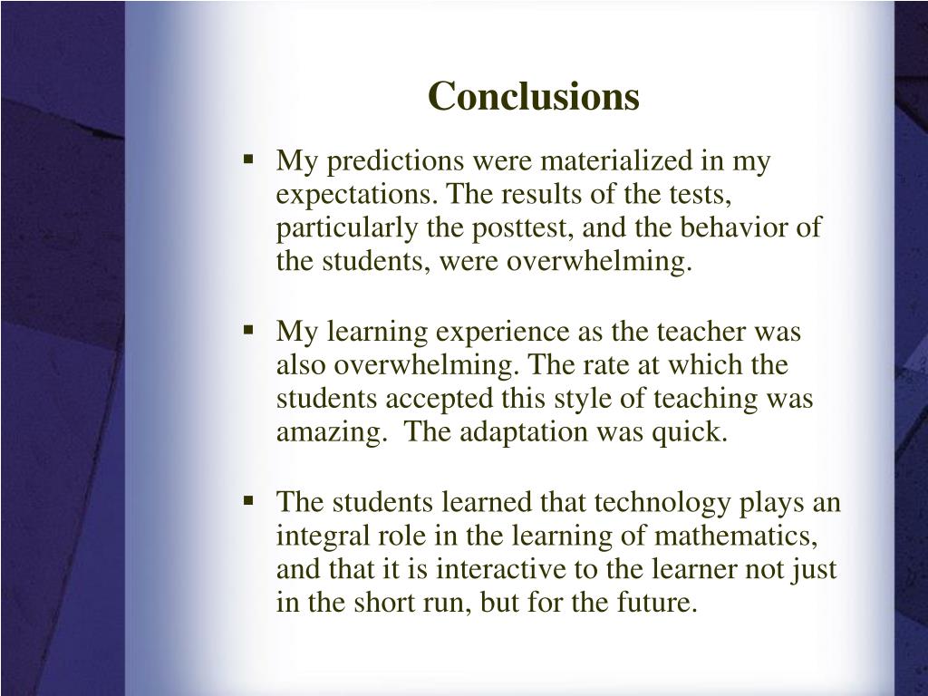 Conclusions • My predictions were materialized in my expectations. The results of the tests, particularly the posttest, and the behavior of the students, were overwhelming. • My learning experience as the teacher was also overwhelming. The rate at which the students accepted this style of teaching was amazing. The adaptation was quick. • The students learned that technology plays an integral role in the learning of mathematics, and that it is interactive to the learner not just in the short run, but for the future.