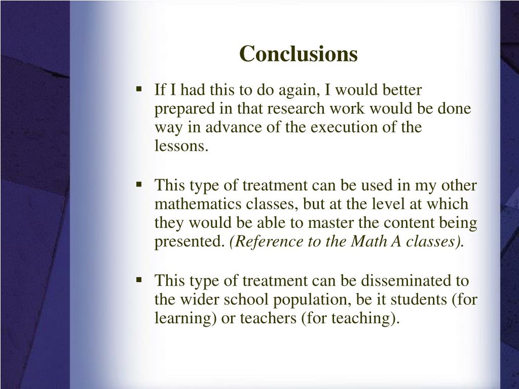 Conclusions • If I had this to do again, I would better prepared in that research work would be done way in advance of the execution of the lessons. • This type of treatment can be used in my other mathematics classes, but at the level at which they would be able to master the content being presented. (Reference to the Math A classes). • This type of treatment can be disseminated to the wider school population, be it students (for learning) or teachers (for teaching).