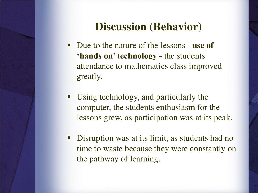 Discussion (Behavior) • Due to the nature of the lessons - use of ‘handson’ technology - the students attendance to mathematics class improved greatly. • Using technology, and particularly the computer, the students enthusiasm for the lessons grew, as participation was at its peak. • Disruption was at its limit, as students had no time to waste because they were constantly on the pathway of learning.