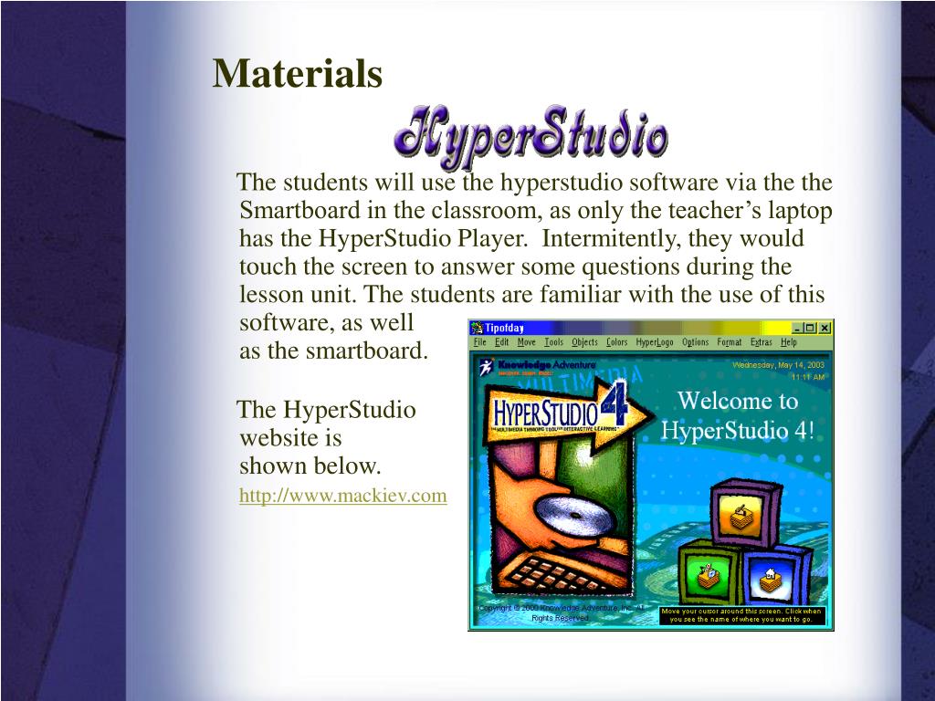 Materials The students will use the hyperstudio software via the the Smartboard in the classroom, as only the teacher’s laptop has the HyperStudio Player. Intermitently, they would touch the screen to answer some questions during the lesson unit. The students are familiar with the use of this software, as well as the smartboard. The HyperStudio website is shown below. http://www.mackiev.com