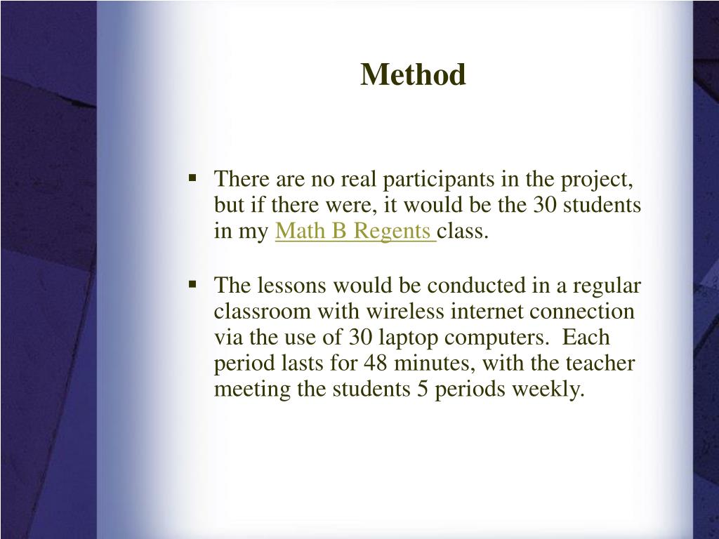 Method • There are no real participants in the project, but if there were, it would be the 30 students in my Math B Regents class. • The lessons would be conducted in a regular classroom with wireless internet connection via the use of 30 laptop computers. Each period lasts for 48 minutes, with the teacher meeting the students 5 periods weekly.