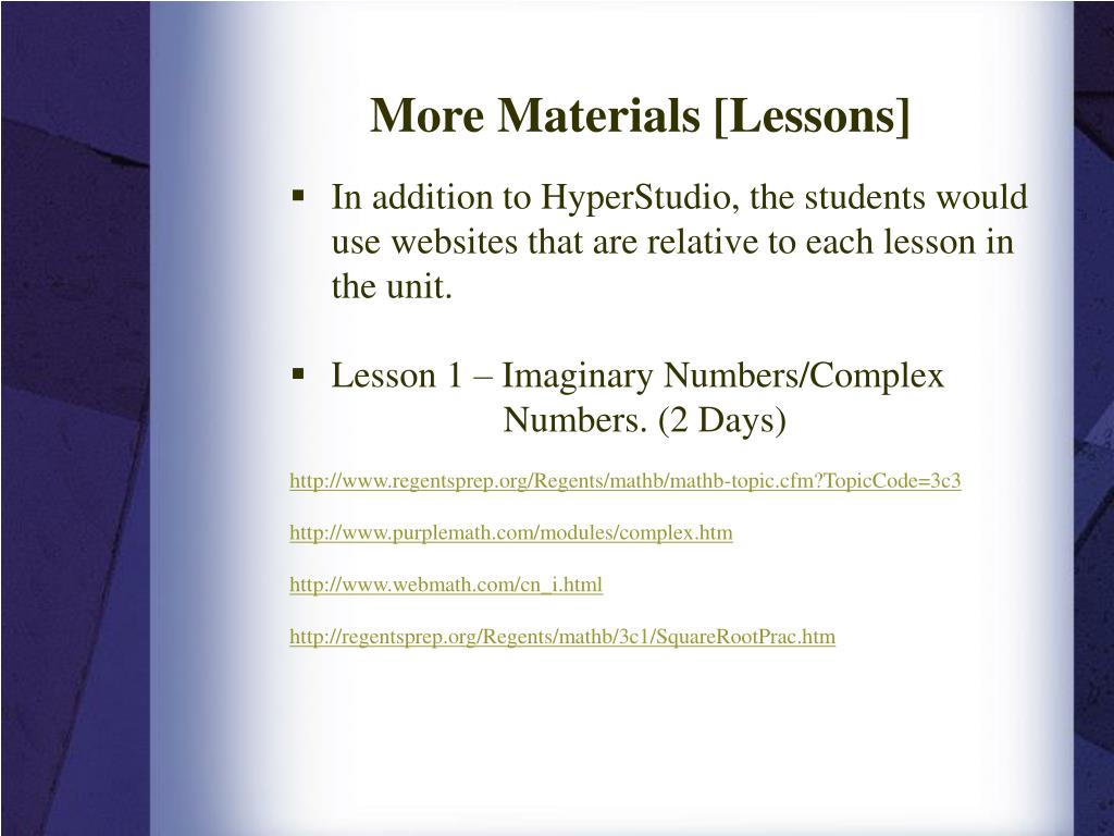 More Materials [Lessons] • In addition to HyperStudio, the students would use websites that are relative to each lesson in the unit. • Lesson 1 – Imaginary Numbers/Complex Numbers. (2 Days) http://www.regentsprep.org/Regents/mathb/mathb-topic.cfm?TopicCode=3c3 http://www.purplemath.com/modules/complex.htm http://www.webmath.com/cn_i.html http://regentsprep.org/Regents/mathb/3c1/SquareRootPrac.htm