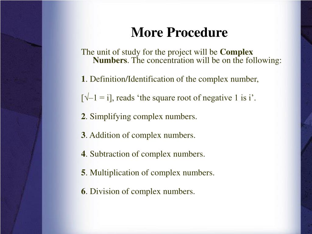 More Procedure The unit of study for the project will be ComplexNumbers. The concentration will be on the following: 1. Definition/Identification of the complex number, [√–1 = i], reads ‘the square root of negative 1 is i’. 2. Simplifying complex numbers. 3. Addition of complex numbers. 4. Subtraction of complex numbers. 5. Multiplication of complex numbers. 6. Division of complex numbers.