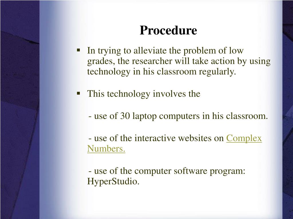 Procedure • In trying to alleviate the problem of low grades, the researcher will take action by using technology in his classroom regularly. • This technology involves the - use of 30 laptop computers in his classroom. - use of the interactive websites on Complex Numbers. - use of the computer software program: HyperStudio.