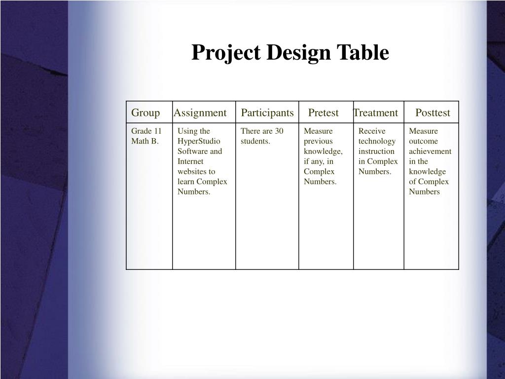 Research Project Design • If this was a real life project, the researcher would use the Pre-Experimental Design that uses the One-Group Pretest-Posttest Design O X O. • The independent variable, X, the treatment that would be administered, would see the students using the HyperStudio software and internet websites that should have helped them to improve their mathematics performance.
