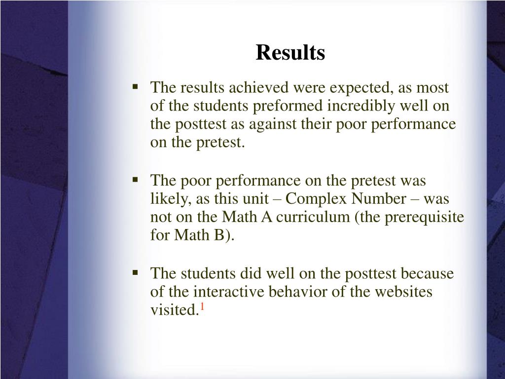 Results • The results achieved were expected, as most of the students preformed incredibly well on the posttest as against their poor performance on the pretest. • The poor performance on the pretest was likely, as this unit – Complex Number – was not on the Math A curriculum (the prerequisite for Math B). • The students did well on the posttest because of the interactive behavior of the websites visited.1