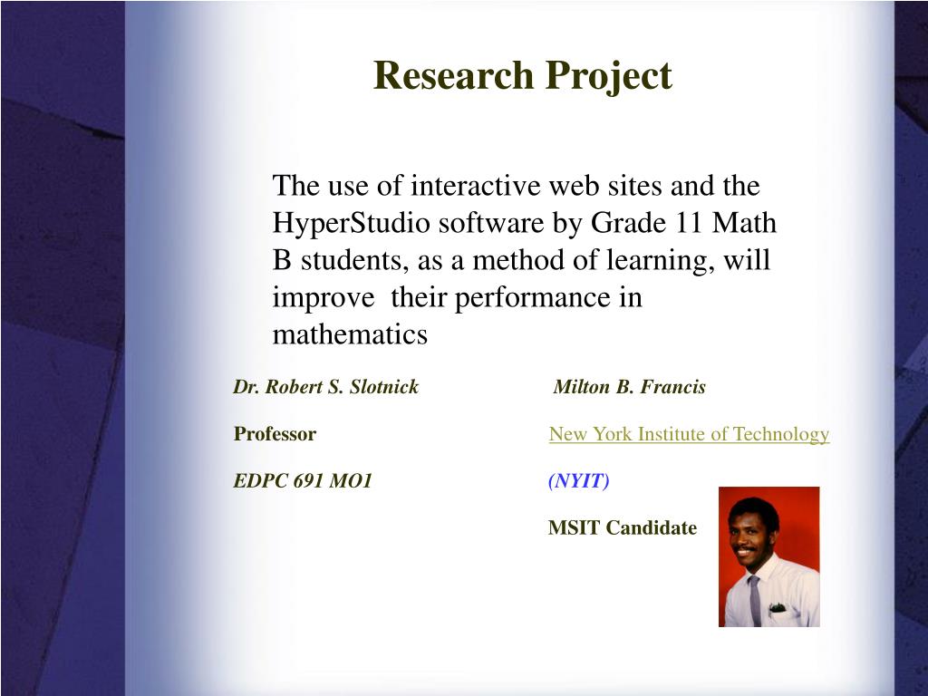 Research Project The use of interactive web sites and the HyperStudio software by Grade 11 Math B students, as a method of learning, will improve their performance in mathematics Dr. Robert S. Slotnick Milton B. Francis ProfessorNew York Institute of Technology EDPC 691MO1 (NYIT) MSIT Candidate