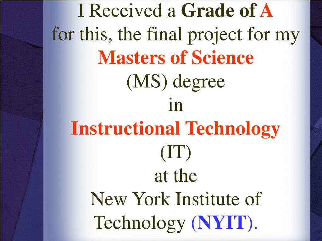 I Received a Grade of A for this, the final project for my Masters of Science(MS) degree in Instructional Technology(IT) at the New York Institute of Technology (NYIT).
