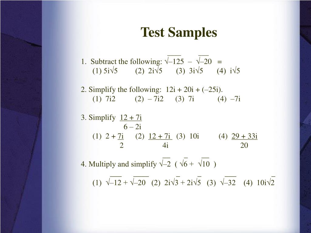 Test Samples ____ ___ 1. Subtract the following: √–125 – √–20 = (1) 5i√5 (2) 2i√5 (3) 3i√5 (4) i√5 2. Simplify the following: 12i + 20i + (–25i). (1) 7i2 (2)– 7i2 (3) 7i (4) –7i 3. Simplify 12 + 7i 6 – 2i (1) 2 + 7i (2) 12 + 7i (3) 10i (4) 29 + 33i 2 4i 20 __ _ __ 4. Multiply and simplify √–2 ( √6 + √10 ) ___ ____ _ _ ___ _ (1) √–12 + √–20 (2) 2i√3 + 2i√5 (3) √–32 (4) 10i√2